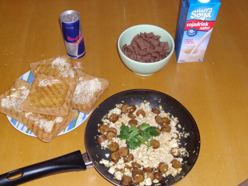 "Tofuspeis" with sausages, toasted slices of bread, cereal with soy milk, and a refreshing cold red bull to have a great start this morning! In addition Rise Against´s "Appeal to Reason"...a dignified alternate for a lost studio day!
